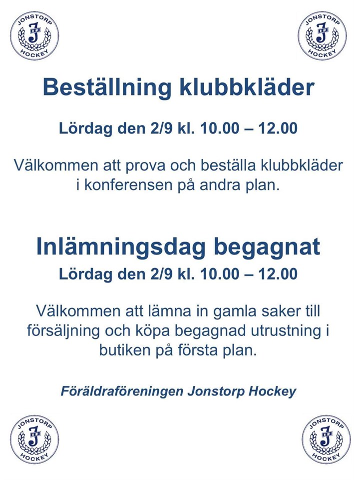 Beställa klubbkläder Datum: 2 september 2023 Tid: 10-12 Var: Klubbrummet/konferensen 2 våningen i ishallen Arrangör: Föräldraföreningen Jonstorp Hockey Inlämning begagnat Datum: 2 september 2023 Tid: 10-12 Var: Butiken i ishallen Arrangör: Föräldraföreningen Jonstorp Hockey Varmt välkomna! Jonstorp Hockey 21 aug 2023 0kommentarer