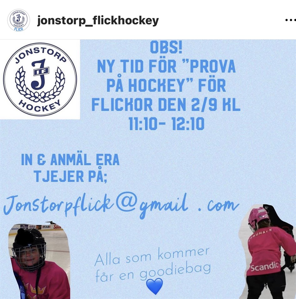 GIRLS GIRLS GIRLS Boka den 2 september kl 11.10 - 12.10. Då blir det prova-på- hockey för flickor i Jonstorps ishall. 💪💯💙 Ålder: 4-13 år Anmäl er via mail till: jonstorpflick@gmail.com Ansvarig ledare: Ellinor Rydell VÄLKOMNA!