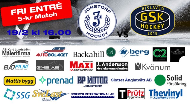 6/3 Gislaved-Jonstorp, resultat 3-4 Efter söndagens bortamatch mot Gislaved som slutade 3-4 till Jonstorp, är det nu klart att Jonstorp är seriesegrare och klara för playoff till Div 1 kval. Kommentar från tränaren: En riktig krigarinsats där vi fattas några tunga pjäser i laguppställningen och ändå lyckas slå Gislaved på full tid som inte hänt på hela fortsättningsserien! Att knipa seriesegern med en match kvar känns också otroligt skönt med tanke på hur jämnt det har varit hela vägen. Extra eloge till hela laget som kom ihop genom hela serien och fick avsluta den som segrare, nu tar vi hand om Värnamo om en vecka innan vi gör oss redo för Play-off. Målskyttar: Felix Pettersson, Benjamin Magnusson, Oskar Gudmundsson, Jacob Persson Nästa hemmamatch, söndag 13/3 kl 16.00 Jonstorp-Värnamo