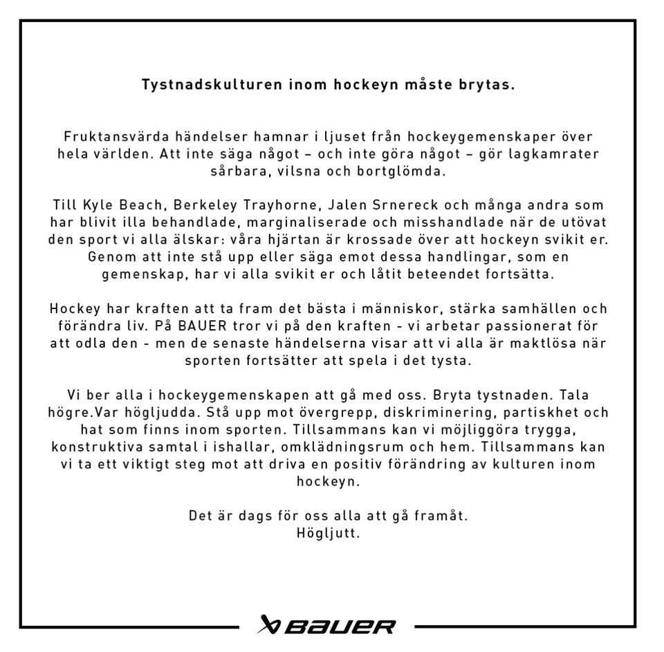 BAUER SVERIGE och JONSTORP HOCKEY agerar mot TYSTNADSKULTUREN INOM SVENSK IDROTT. Vi är fast beslutna att bryta tystnaden. 💙 . . . #vihör #viser #vibryross #bauerhockey #jonstorphockey Jonstorp Hockey 12 nov 2021 1kommentar