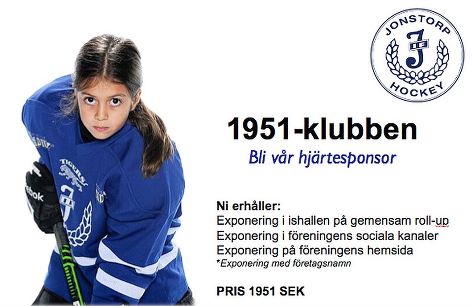 Vill du, din arbetsgivare eller ditt företag bli Hjärtesponsor i 1951-klubben hos Jonstorp Hockey? Som sponsor i 1951-klubben bidrar du/öretaget till att våra spelare i alla åldrar, från Hockeyskolan genom ungdomsverksamheten upp till A-laget kan fortsätta leva hockeydrömmen. Skicka gärna ett mail eller lämna en kommentar här, så återkopplar vi snarast. Är ni nyfikna på andra (läs större) sponsorsamarbeten? Kontakta oss. Mail: kansli@jonstorphockey.se T A C K P Å F Ö R H A N D!