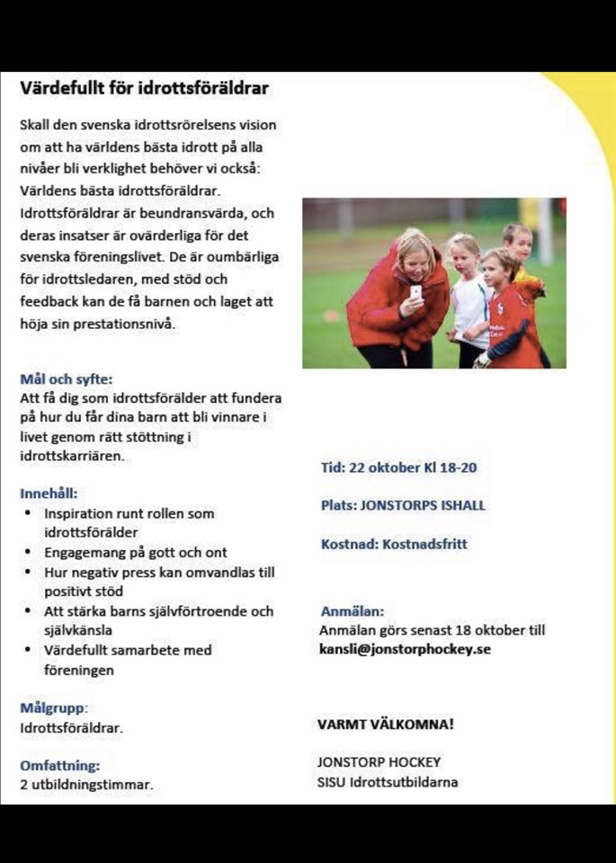 Känn er varmt välkomna till SISU’s och Jonstorp Hockeys inspirationskväll med tema ”Världens bästa Idrottsföräldrar.” Den 22 oktober kl 18-20 i klubbrummet på andra våningen. Hur stöttar vi våra barns idrottande på bästa sätt? Hur kan vi föräldrar bidra till barnens/ungdomarnas och föreningens bästa? Ingen kan göra allt men många kan göra något. Vi ser fram emot en trevlig kväll med många bra vertyg att ta med oss på våra barns gemensamma hockeyäventyr. Anmäl er till: kansli@jonstorphockey.se senast den 18 oktober. //Jonstorp Hockey Skåne Idrotten SISU Jonstorp Hockey 8 okt 2019 0kommentarer